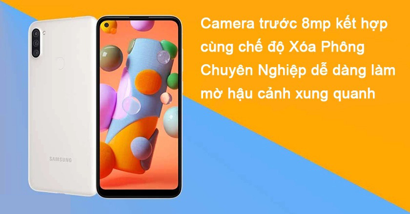 Còn ở mặt trước, Samsung A11 được trang bị camera selfie có độ phân giải 8MP, khẩu độ f/1.9 và hỗ trợ HDR. Độ phân giải và khẩu độ “khủng” giúp camera của máy có thể bắt được chủ thể rõ nét ở điều kiện thiếu sáng, Galaxy A11 hứa hẹn sẽ là người bạn đồng hành của người dùng mọi nơi.